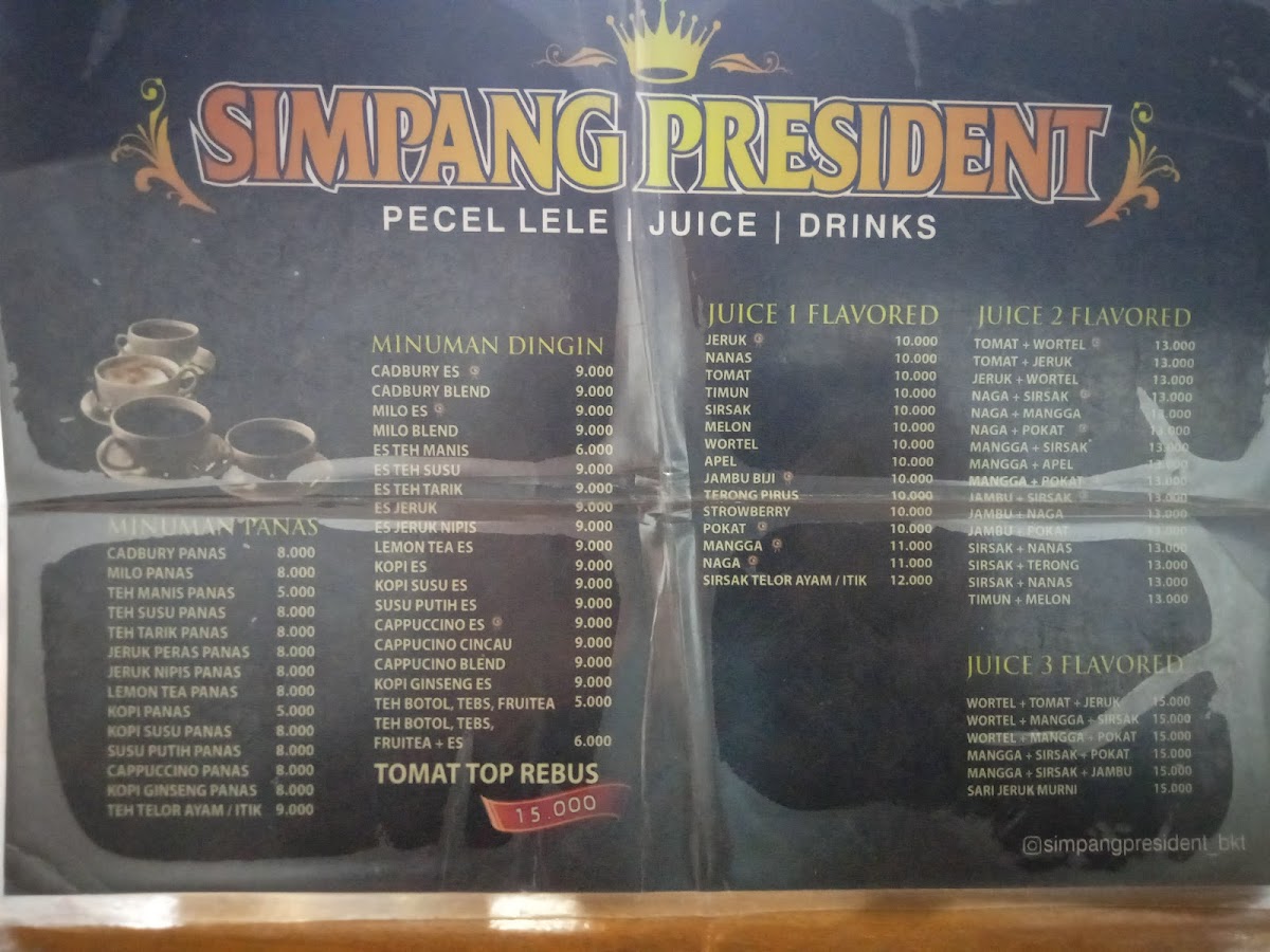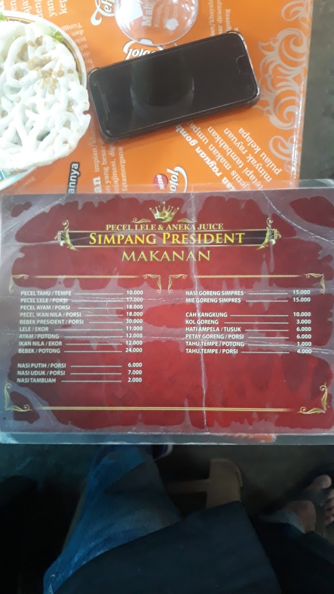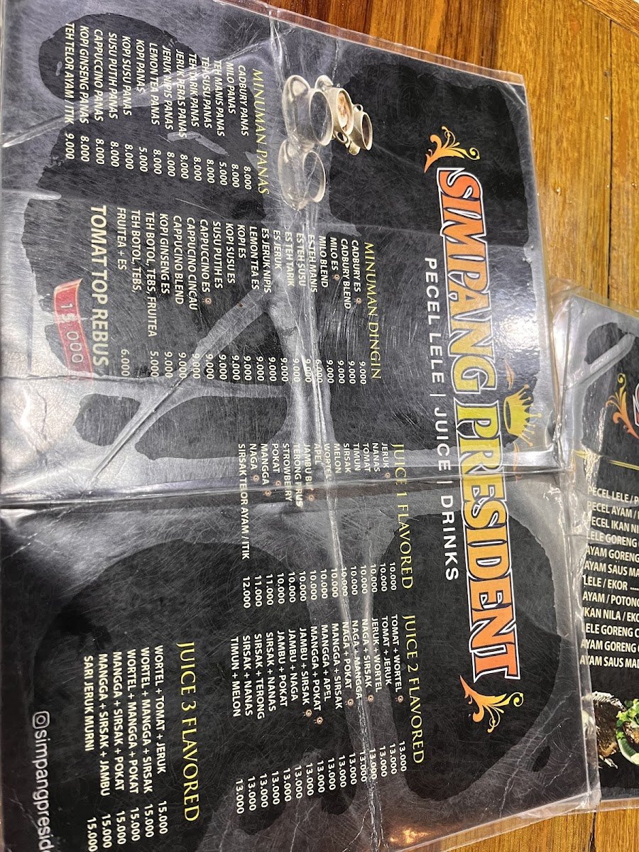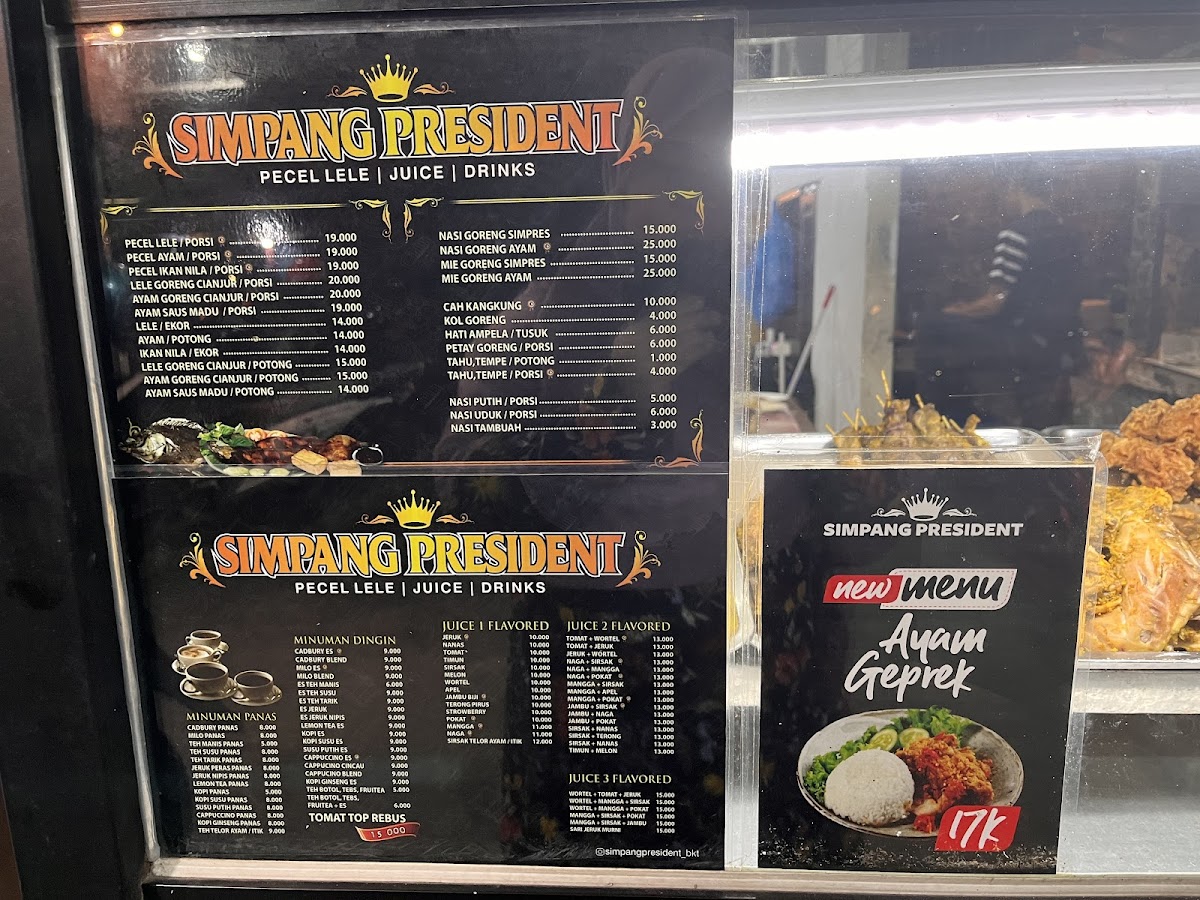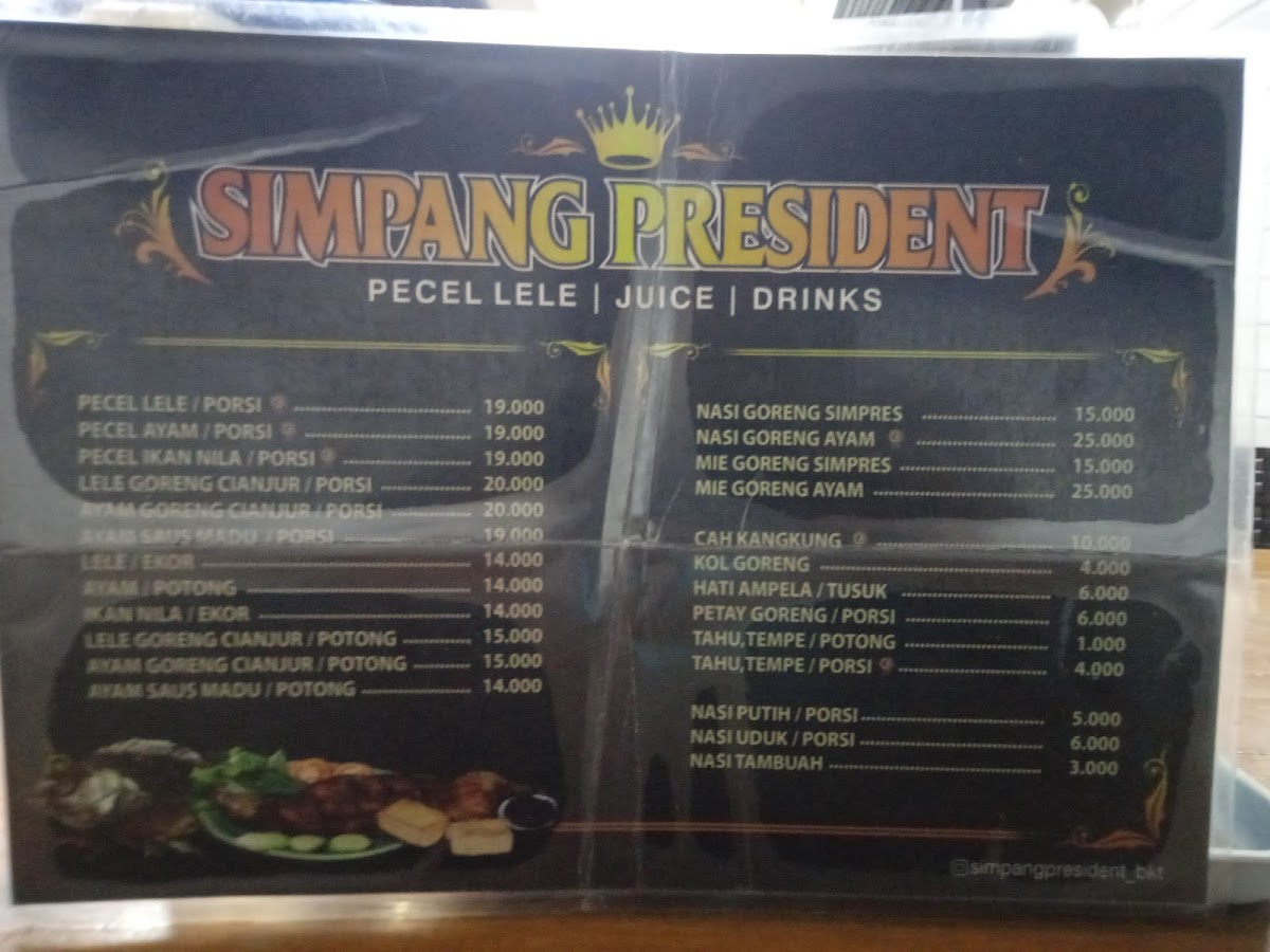 The menu at Pecel Lele Simpang President feels straightforward and comforting, focusing on familiar Indonesian staples that emphasize flavor over complexity. Nila Goreng stands out as a reliable highlight, delivering a crispy exterior with tender fish inside, making it a satisfying choice for anyone who enjoys classic fried dishes. Nasi Goreng complements the menu perfectly, offering a well-balanced fried rice that works either as a main dish or as a companion to other items. For diners looking for something simple to refresh the palate, Air Putih is always available and fits naturally into the no-frills dining experience. An interesting mention on the menu is Telah Di Buka Cabang Pecel Lele Simpang Presiden Cek Lokasi Kubang Putih, reflecting the restaurant’s growing presence and adding a sense of local pride to the overall dining narrative. Taken together, the menu feels cohesive and approachable, staying true to traditional tastes while giving diners exactly what they expect from a casual, local restaurant known for consistency and value.